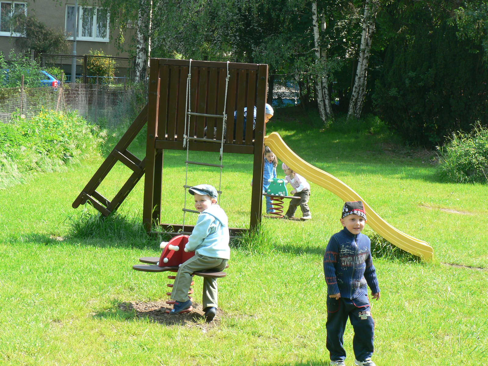 Zahrada školky se nachází v sousedství budovy školky. Je vybavena tak, aby splnila potřeby naší školky - pískoviště, skluzavka, houpačky, jednoduché vybavení pro pohybové aktivity dětí.